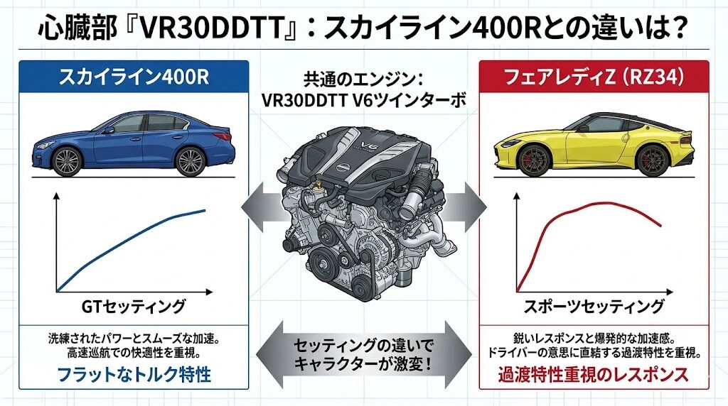 2. 心臓部「VR30DDTT」:スカイライン400Rとの違いは?