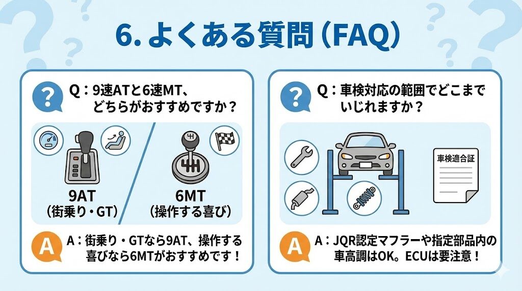 A:街乗りやGT走行がメインなら、圧倒的に9速ATです。400R以上の加速をスムーズに楽しめます。一方で、シンクロレブコントロールを備えた6速MTは、操作する喜びを重視する方に最適です。