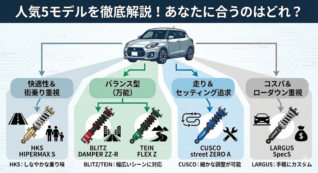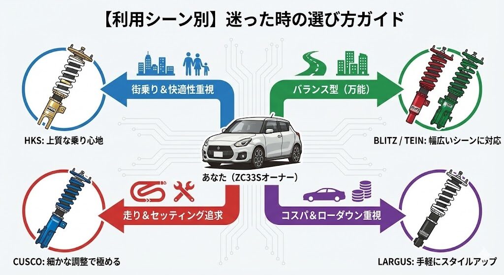 今回は、街乗りからサーキットまで、ZC33Sにおすすめの人気車高調5選を徹底比較します。