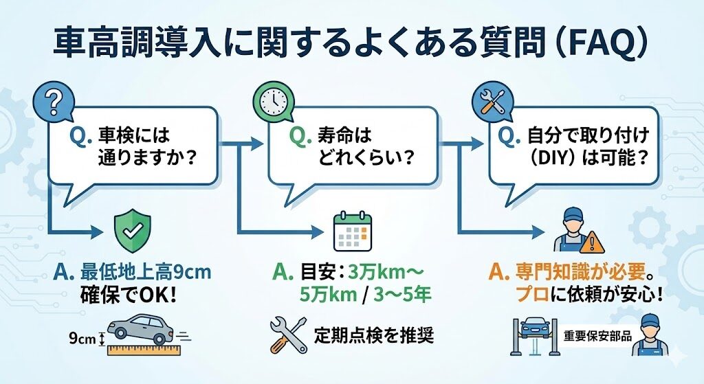 A. 最低地上高が「9cm以上」確保されていれば、基本的に車検は通ります。ただし、フォグランプやウィンカーの高さ制限にも注意が必要です。