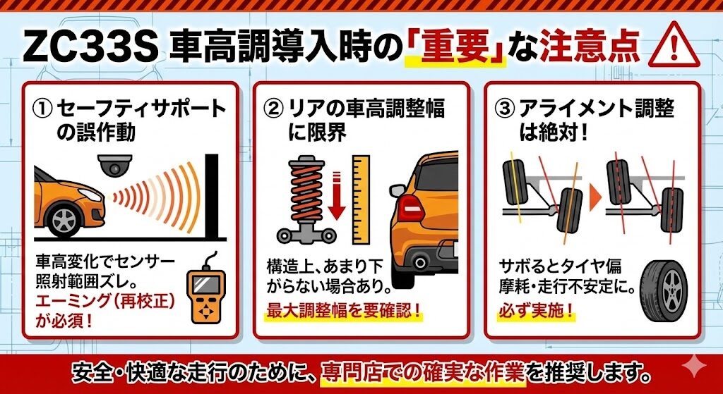 ZC33Sのリアサスペンション構造上、メーカーによっては「思っていたより下がらない」場合があります。全下げを狙う方はスペック表の最大調整幅をチェックしてください。 - 仕上げのアライメント調整