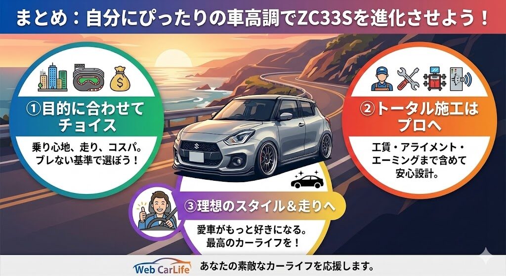 納得のいく車高調を選んで、理想のスイスポライフを楽しみましょう!