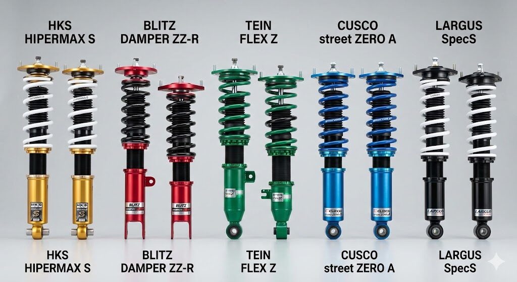 - BLITZ DAMPER ZZ-R または TEIN FLEX Z が定番。全長調整式でセッティングの幅も広いです。