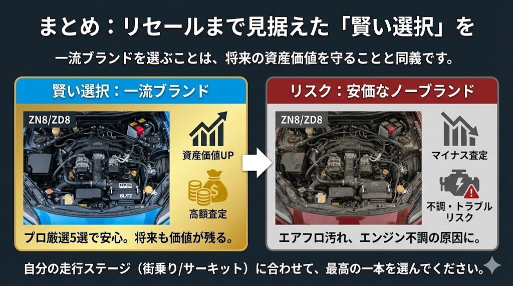 ZN8/ZD8のパーツ選びにおいて、「HKS」や「BLITZ」といった一流ブランドを選ぶことは、将来的な売却価格(資産価値)を守ることと同義です。