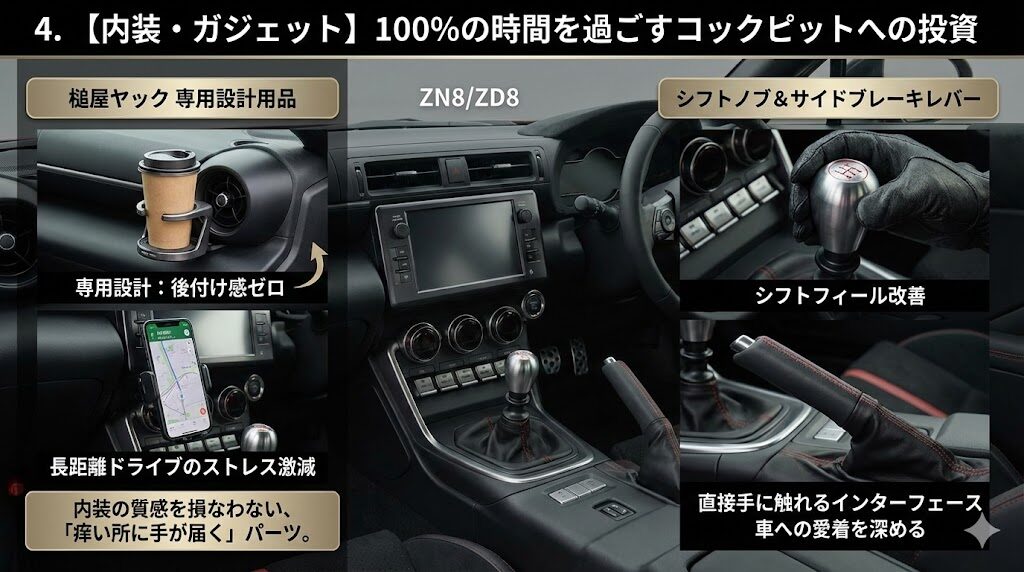 - 槌屋ヤック 専用設計用品: ZN8/ZD8専用設計のドリンクホルダーやスマホホルダーは、後付け感が一切なく、内装の質感を損ないません。こうした「痒い所に手が届く」パーツは、長距離ドライブのストレスを劇的に軽減します。