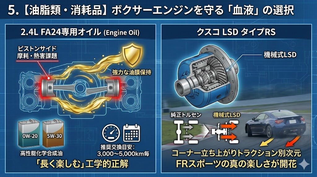- 2.4L FA24専用オイル: 水平対向エンジンは、その構造上、ピストンサイドの摩耗や熱害が課題となります。特に高回転を多用するなら、油膜保持能力に優れた高性能化学合成油(0W-20〜5W-30)を3,000〜5,000km毎に交換するのが「長く楽しむ」ための工学的な正解です。