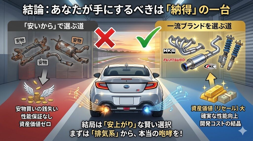2026年現在、騒音規制は年々厳しくなっています。「爆音=速い」の時代は終わりました。ディーラー入庫やリセールを考えるなら、必ず「JQR認証」等の車検対応品を選んでください。