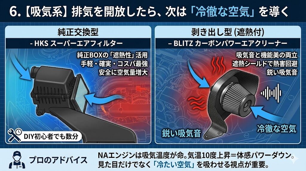 NAエンジンにとって、吸気温度の上昇は致命的です。気温が10度上がれば、体感できるほどパワーは落ちます。見た目や音だけでなく、「いかに冷たい空気を吸わせるか」という視点を忘れないでください。